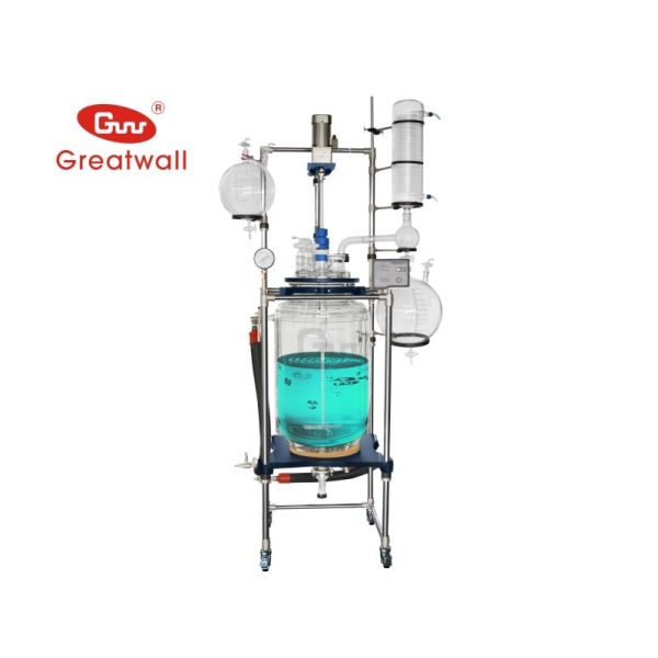 These Zhengzhou Greatwall GR series double walled glass vacuum kettle are designed for synthetic reaction of different types of materials in a controlled temperature and vacuum environment. Each reactor features adjustable stirring speeds and a constant pressure feeding funnel that allows you to add material to the vessel at a uniform and controlled speed. The built-in condenser makes it possible to recover some materials, also at a controlled rate of speed.